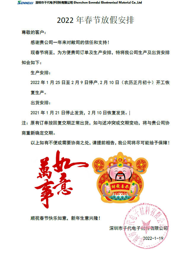 开云官方端网站登录入口 - 公司新闻感谢各位新老客户朋友2021年对我司的信任与支持,2022年春节来临之际,祝您新春快乐如意,新年生意兴隆,万事如意!放假时间:2022年1月25日(腊月二十三)至2月9日(正月初九),共16天,2月是10日(正月初十)正常上班发货。